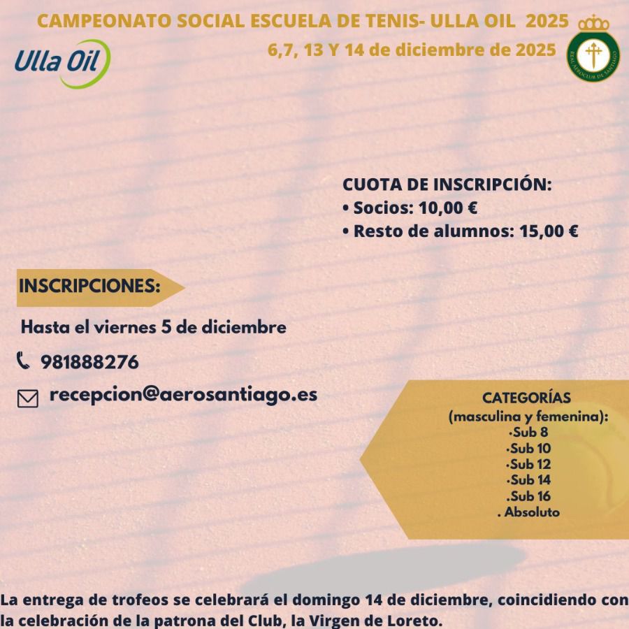 Los días 6, 7, 13 y 14 de diciembre de 2025 se celebrará en nuestras instalaciones el Campeonato Social  Escuela de Tenis – ULLA OIL.