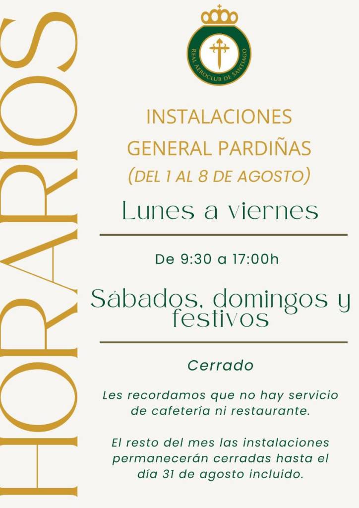 Informamos de que, en el mes de Agosto, las instalaciones de la sede social de General Pardiñas abrirán desde el día 1 hasta el día 8 (ambos incluidos) sólo los días laborables, el fin de semana permanecerá cerrado.