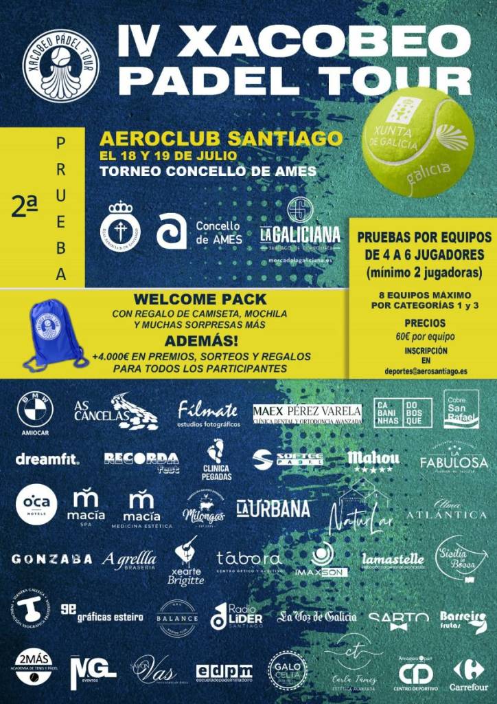 El 18 y 19 de julio celebraremos la prueba del IV Xacobeo Padel Tour – Torneo Concello de Ames, que este año presenta la gran novedad de ser una competición POR EQUIPOS de 4 6 jugadores (debe haber al menos dos jugadoras en cada equipo)