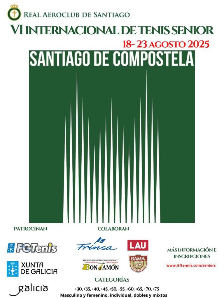 Del 18 al 23 de agosto, el Real Aero Club de Santiago acogerá el VI Internacional de Tenis Senior. Durante toda la semana, nuestras pistas serán escenario de un torneo que reúne a jugadores veteranos en un ambiente deportivo y social inmejorable.